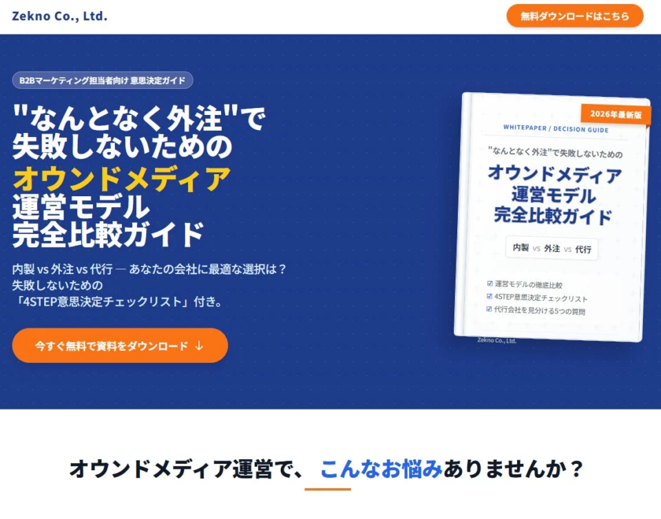 株式会社ゼクノは、B2B企業のマーケティング担当者向けに、この課題を解決するための無料ホワイトペーパー「”なんとなく外注”で失敗しないための オウンドメディア運営モデル完全比較ガイド(2026年最新版)」を公開しました!✨