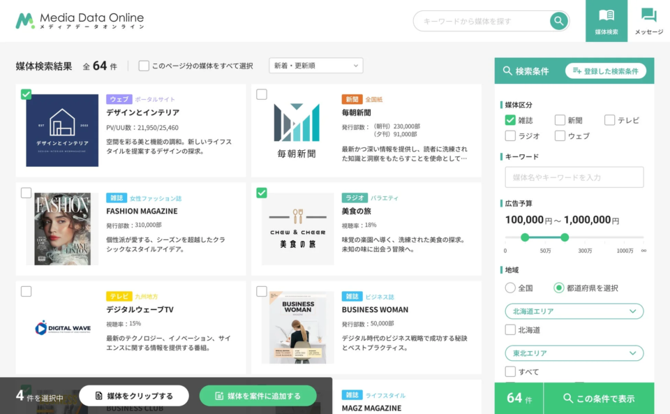 新聞、雑誌、テレビ、ラジオ、Webメディアなど、約4,500媒体(2026年3月時点)の情報を一元的に検索・比較できます。キーワード、エリア、読者属性、年収、SNSフォロワー数など、多様な条件を組み合わせて、目的に合った媒体を効率的に見つけることが可能です。共通フォーマットにより、媒体比較の効率も大幅に向上します。