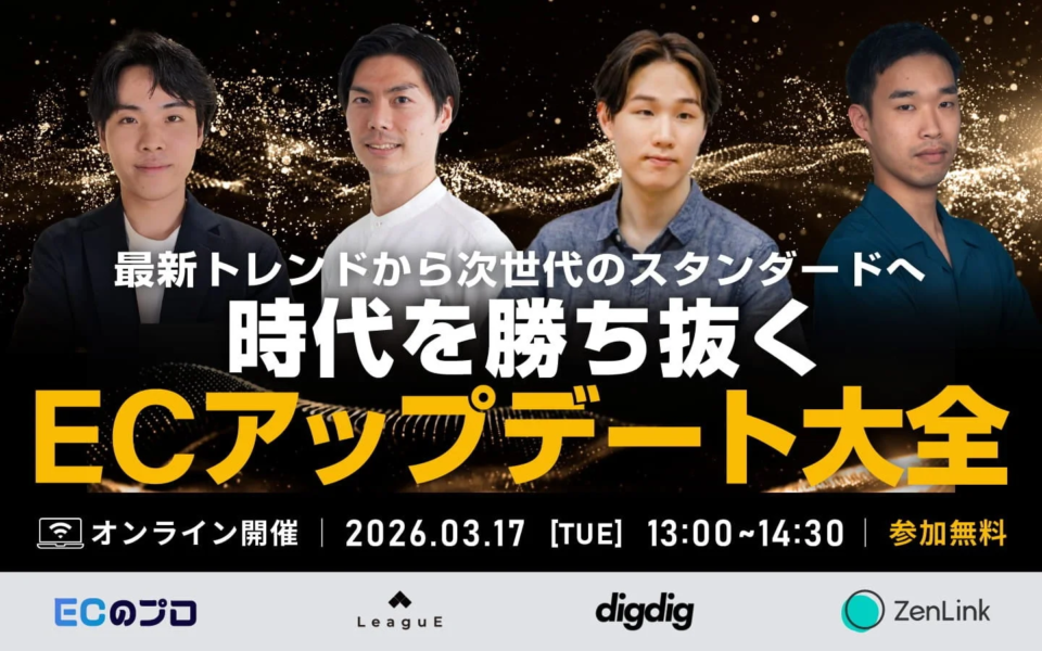 2026年3月17日(火)13時より、株式会社LeaguE、株式会社WUUZY(ECのプロ)、株式会社digdig、ZenGroup株式会社の4社共催によるオンラインセミナー『〜最新トレンドから次世代のスタンダードへ時代を勝ち抜く〜ECアップデート大全』が開催されます。本セミナーでは、閉塞感を打破する3つの次世代戦略がプロの視点から徹底解説されます。
