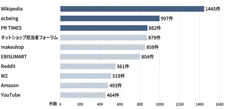 上位サイトには、Wikipedia、ecbeing、ネットショップ担当者フォーラム、makeshop、EBISUMARTといった、情報サイト、専門メディア、ECプラットフォームが名を連ねています。特にWikipediaが圧倒的な参照数を示しており、基本的な情報源としての重要性が浮き彫りになりました。