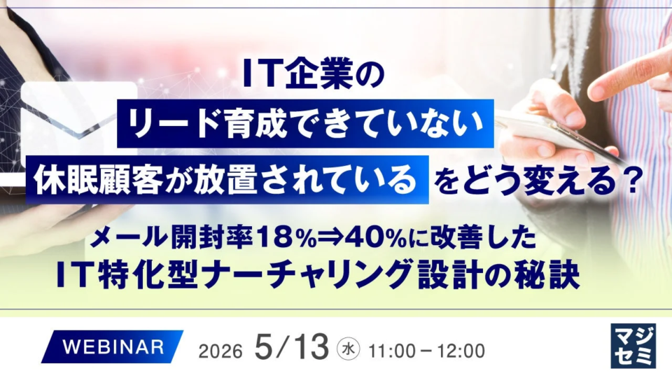 このウェビナーは、IT企業のマーケティング担当者や経営者にとって、リード育成と休眠顧客活性化の具体的なヒントを得る貴重な機会となるでしょう。お見逃しなく!