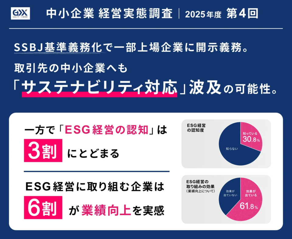 2025年度第4回中小企業経営実態調査によると、サステナビリティ開示基準(SSBJ基準)の策定が進み、上場企業に対してサプライチェーン全体での情報開示が義務化される動きは、その取引先である中小企業にも「サステナビリティ対応」という新たな経営課題をもたらしています。これは、企業の競争力や取引条件に直接影響を及ぼす可能性を秘めています。