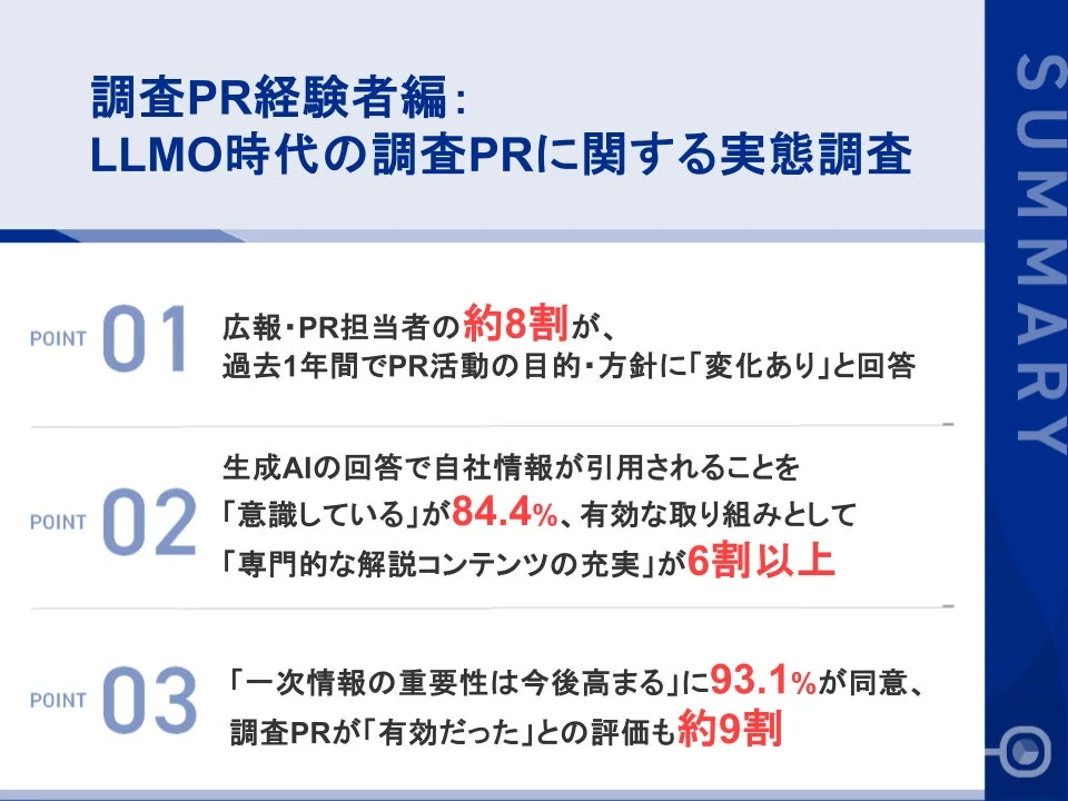 今回の調査結果から、PR活動は従来のメディア露出中心のアプローチから、検索エンジンや生成AIを介した情報流通への対応へと大きく変化していることが明確になりました。特に、生成AIの回答で引用される「一次情報」の価値はますます高まり、独自の調査データや専門的なコンテンツを継続的に発信し、検索・生成AIの双方から参照される情報資産を構築することが、今後のPR活動において不可欠と言えるでしょう。