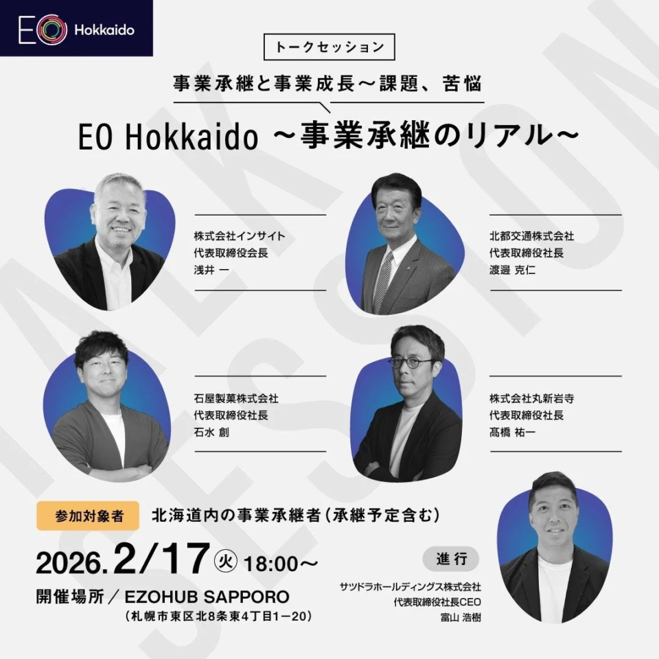 2026年2月17日(火)、北海道札幌市にあるEZOHUB SAPPOROにて、一般社団法人EO Hokkaido主催のオープンイベント「事業承継のリアル」が開催されます。このイベントは、北海道内で事業承継に携わる経営者や承継予定者を対象に、事業承継と事業成長に関する率直なトークセッションを提供するものです。