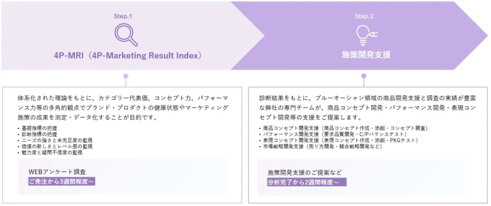 「4P-MRI」では、WEBアンケート調査の企画・設計から実査、分析までを一気通貫でサポートします。さらに、商品開発に豊富な実績を持つ専門チームによる、診断後の伴走支援も提供されます。これにより、分析結果を具体的な施策へと確実に繋げることが可能です。