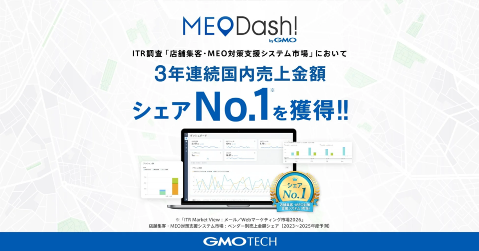 店舗集客の要となるMEO(Map Engine Optimization)対策において、GMOインターネットグループのGMO TECH株式会社が提供する「MEO Dash! byGMO」が、ITR調査「ITR Market View:メール/Webマーケティング市場2026」の「店舗集客・MEO対策支援システム市場」において、3年連続で国内売上金額シェアNo.1を獲得しました!これは2023年度・2024年度の実績に加え、2025年度予測も含む快挙です。🎉