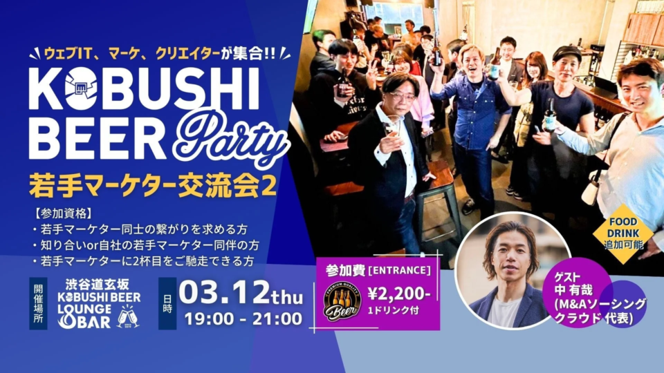 2026年3月12日(木)19時より、KOBUSHI MARKETING合同会社が運営する『KOBUSHI BEER LOUNGE & BAR』にて、若手マーケターを対象とした交流会が開催されます。デジタルマーケティング、新規事業、DX領域で活躍する若手人材が集い、AI/DX時代におけるキャリアや業界の未来について語り合う貴重な機会となるでしょう。
